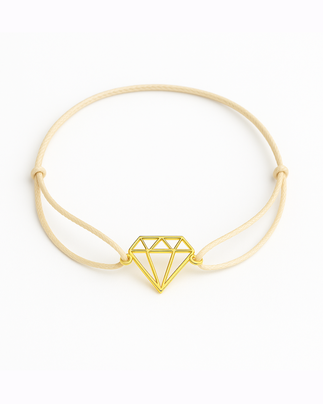 Elegantní náramek s jemným motivem diamantu je symbolem vnitřní síly, čistoty a jedinečnosti. Minimalistický přívěsek ze stříbra Ag550, pozlacený 24karátovým zlatem, krásně vyniká na decentní krémové šňůrce. Díky nastavitelnému uzlíku se pohodlně nosí a skvěle padne každému zápěstí.